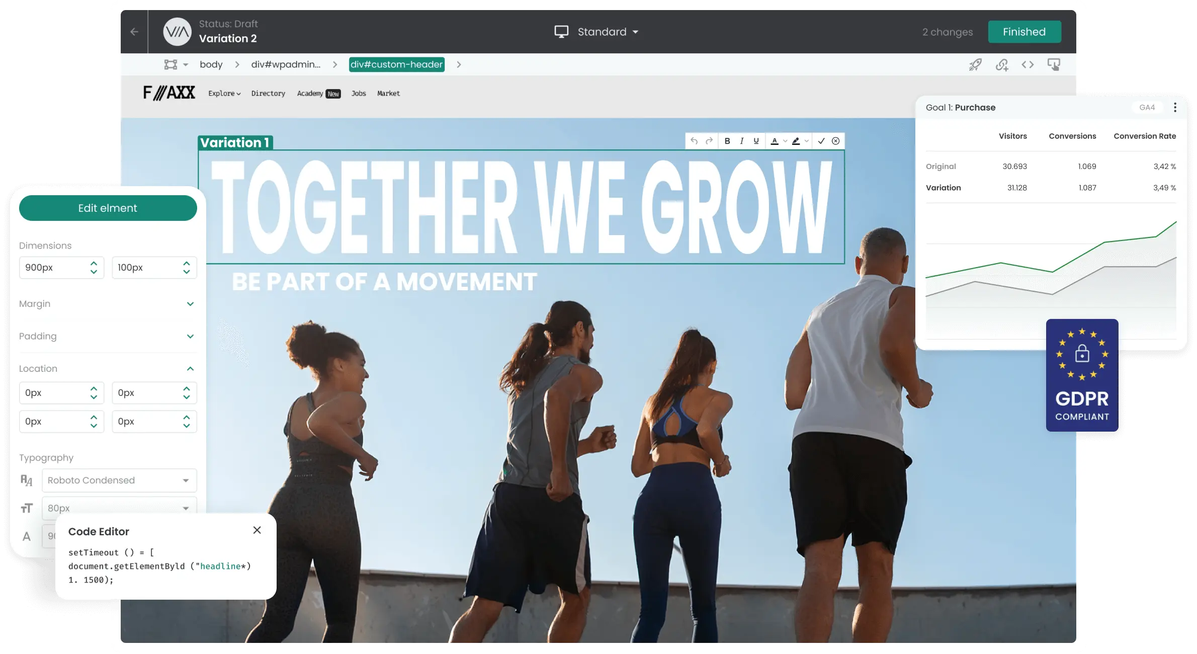 Mit Varify erstellst du Experimente mühelos einfach: Ändere Texte, Bilder, Styles und verschiebe Elemente oder ganze Sektionen.