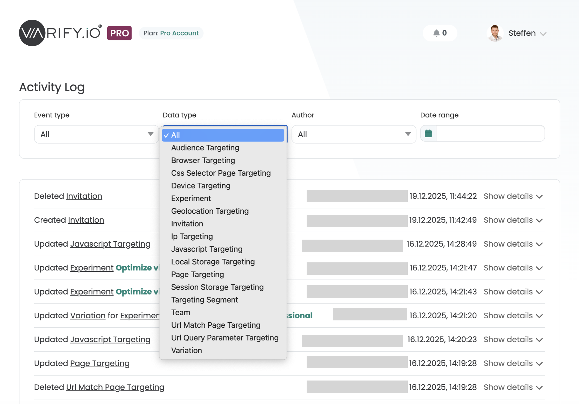 Mit dem Activity Log können der Account Owner sowie berechtigte Nutzer nachverfolgen, welche Änderungen im Account vorgenommen wurden, zum Beispiel das Erstellen oder Ändern von Experimenten. Diese Funktion sorgt für Transparenz und ermöglicht eine einfache Überwachung der Aktivitäten innerhalb der Plattform.