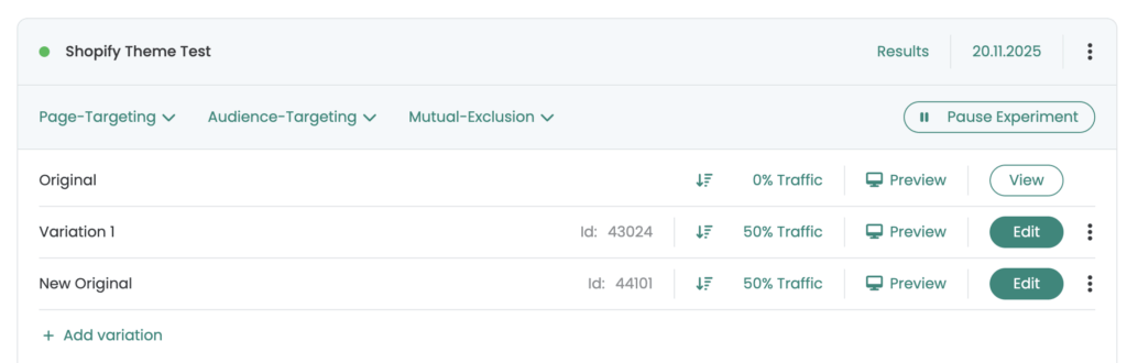 Sobald deine User einmal die Preview Theme Variante gesehen haben, werden dieses auch nach Beendigung des Experiments weiterhin sehen. Damit die User nun wieder dein Original Theme sehen, kannst du ein “Clean Up” Experiment starten. Erstelle dafür einfach ein neues Experiment und füge den JavaScript Code der “New Original” Variante (siehe weiter oben) unter “Add JS” ein. Speichere das Experiment unter einem Namen deiner Wahl ab. Setze die Traffic Allocation auf 100% Variante und starte das Experiment.