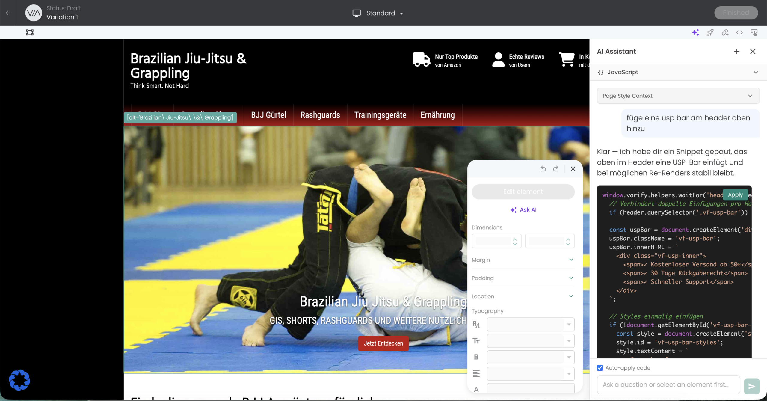 With the help of Prompt Based Experiments (PBX), experiments can be created directly in the visual editor with the help of AI. Simply describe to the AI what you want to test and the AI creates the changes directly. For developers: The AI delivers javaScript code that can be adapted directly.