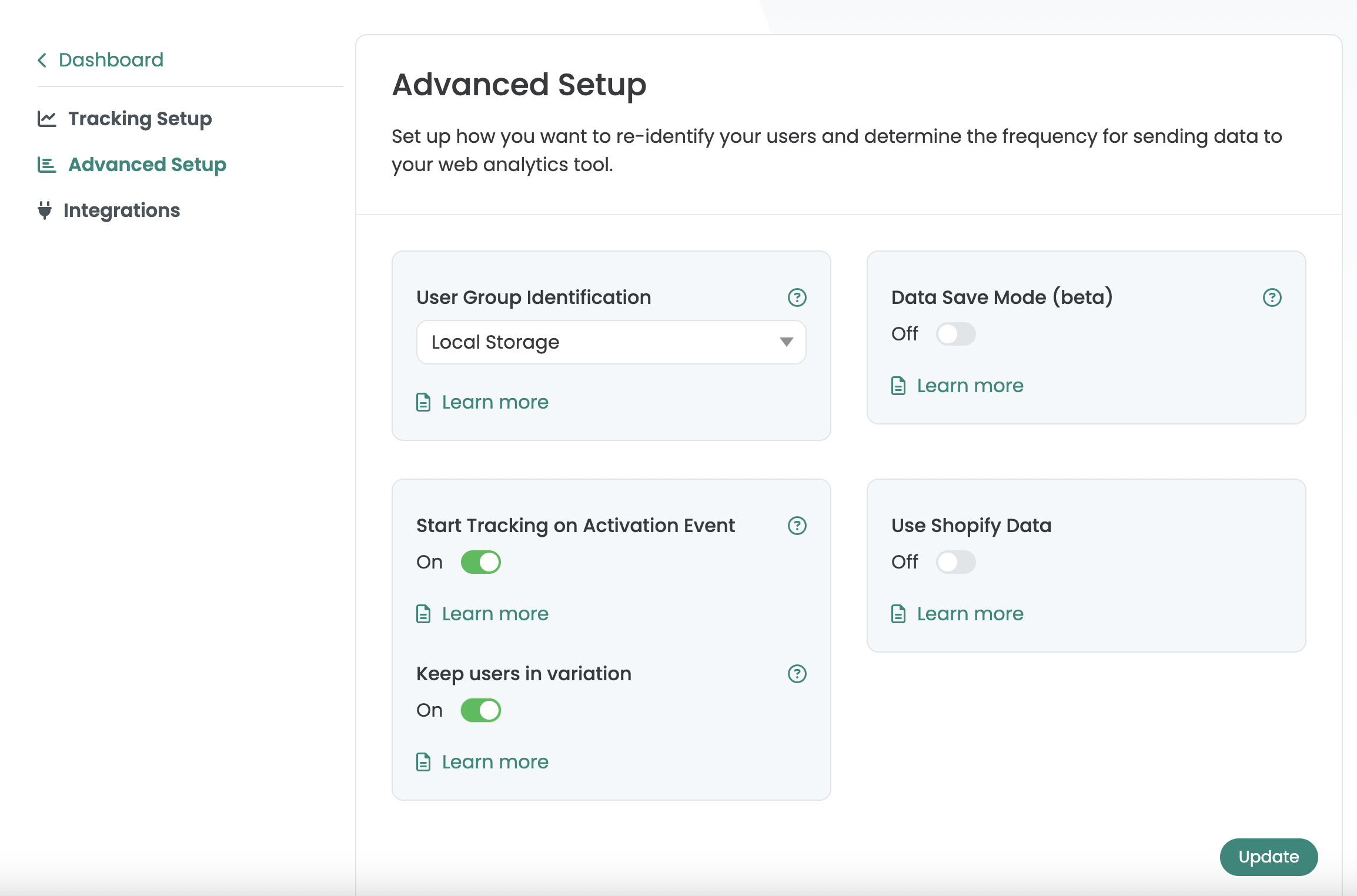 Além disso, quando a opção “Iniciar rastreamento no evento de ativação” está ativada, a opção “Manter usuários na variação” é exibida. Se estiver ativada, os usuários sem o “Script de ativação de rastreamento” executado serão armazenados no “Armazenamento de sessão”, fazendo com que vejam a mesma variação durante a sessão. Após a execução do script, as informações são transferidas do “Armazenamento de Sessão” para o “Armazenamento Local” e o usuário é atribuído permanentemente a uma variação. Essa opção deve ser usada especialmente quando, por exemplo, é possível navegar no site sem interagir com o banner de cookies, pois os usuários permanecem atribuídos permanentemente à variação inicialmente atribuída durante a sessão, mesmo sem concordar com o banner de cookies.