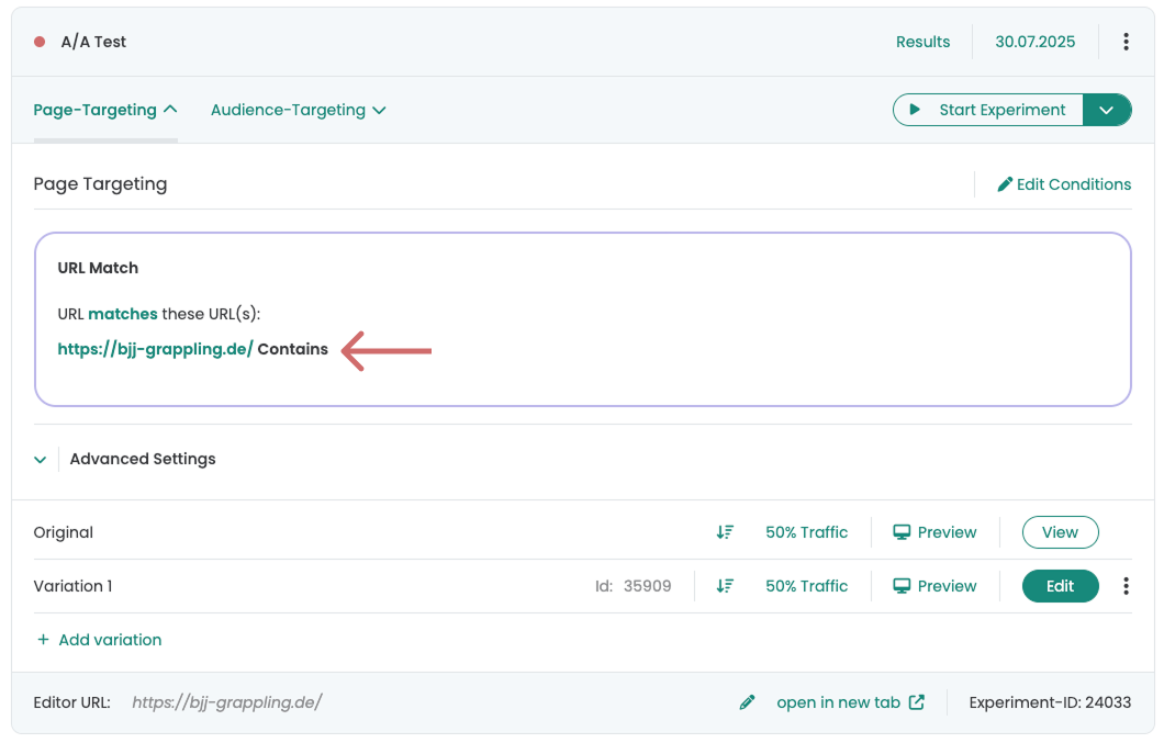 Um teste A/A é um teste A/B que não mostra alterações visíveis para o usuário. Você pode descobrir como criar um teste A/A aqui: Iniciar um teste A/A