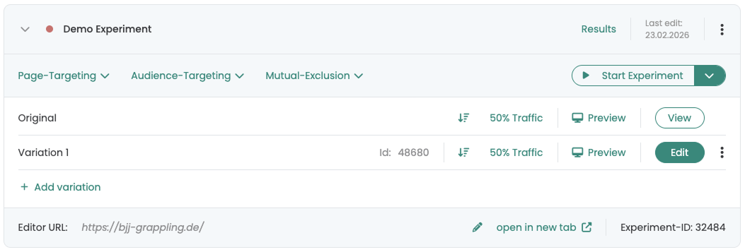 Varify.io® ile deneylerinizi hiç vakit kaybetmeden oluşturabilir ve başlatabilirsiniz. Bunu yapmak için önce yeni bir varyant oluşturun ve kaydedin. Daha sonra kontrol panelinde denemeniz için çeşitli ayarlar yapabilirsiniz. Son olarak, bir sayfa hedeflemesi tanımlayarak ve başlat düğmesine basarak deneyi başlatın.